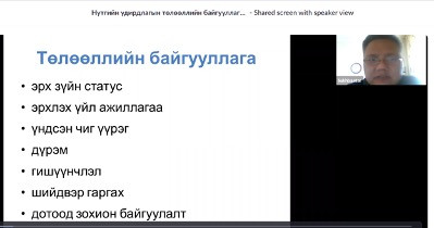 “НУТГИЙН УДИРДЛАГЫН ТӨЛӨӨЛЛИЙН БАЙГУУЛЛАГЫН ЭРХ ЗҮЙН ЗОХИЦУУЛАЛТ” цахим хэлэлцүүлэг болов.